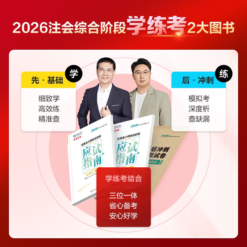 正保会计网校官方现货推出2026年注册会计师综合阶段考试系列图书,涵盖《应试指南》《基础讲义》《最后冲刺8套模拟试卷》《必刷题库》《押题模考练习》等核心资料,紧扣最新考试大纲,内容权威、体系完整。教材由资深教研团队精心编写,注重理论与实践结合,帮助考生系统梳理知识点、突破重难点。模拟试卷高度仿真,押题精准,强化实战训练;题库覆盖高频考点,支持多维度练习。适合不同基础考生使用,是备考CPA综合阶段的高效利器,助力考生顺利通过考试。
