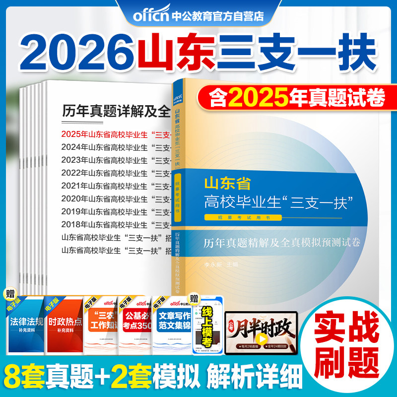 中公教育2026年“三支一扶”考试资料,专为山东、湖南、湖北、重庆、广西、江西、四川、河南、河北、内蒙古、云南、安徽等省份考生精心研发。资料涵盖《公共基础知识》核心考点,系统梳理政治、法律、经济、公文、农业农村等高频内容,配套历年真题、专项刷题库及权威预测卷,帮助考生全面掌握命题规律与答题技巧。题目紧贴各省考情,解析详尽,强化实战能力。无论是基础巩固还是冲刺提分,本系列资料均为备考“三支一扶”的高效利器,助力考生科学备考、顺利上岸。