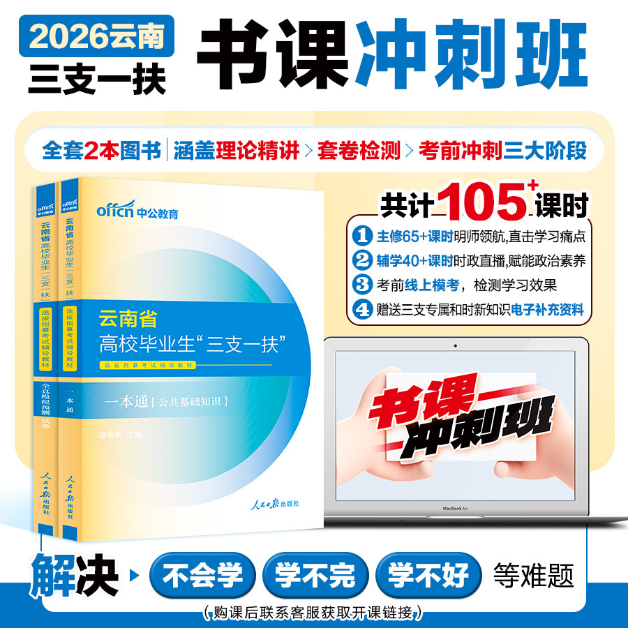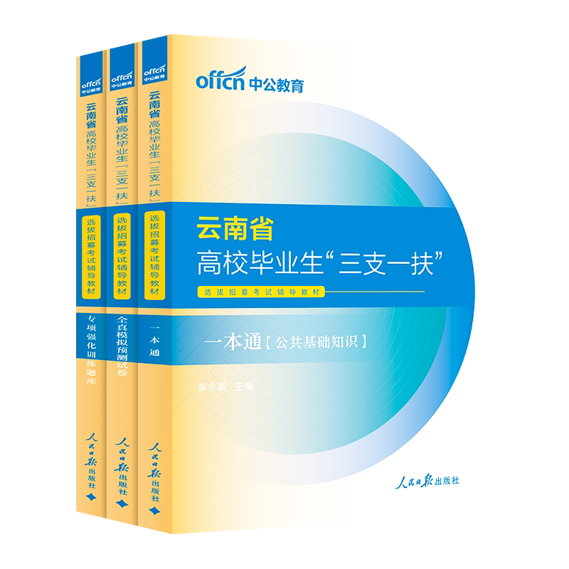 2026年云南省“三支一扶”招聘考试备考资料(中公教育)全面覆盖考试核心内容,包含《一本通》教材、系统网课、历年真题、模拟试卷及最新时政公基题库。资料紧扣云南考情,聚焦公共基础知识,涵盖政治、法律、经济、人文、科技、农业农村等重点模块,助力考生夯实基础、掌握考点。配套网课由资深讲师精讲,讲练结合,提升应试能力。真题与模拟题贴近实战,强化答题技巧。特别针对支教岗位增设教育相关知识,满足差异化备考需求。整体内容权威、系统、高效,是云南“三支一扶”考生上岸的理想选择。