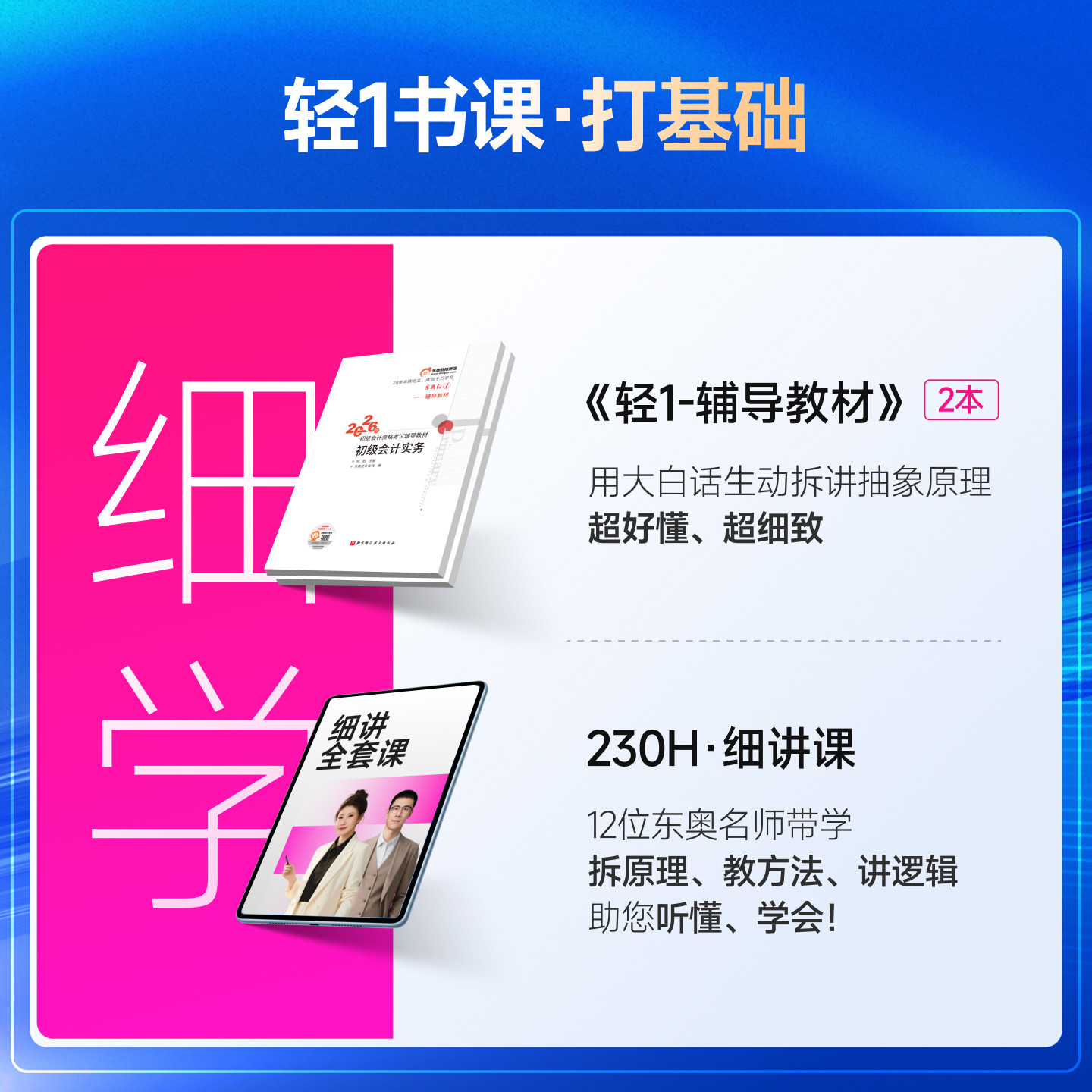 【新书上市】东奥2026年初级会计职称考试辅导教材全新上线!本套书课组合涵盖《初级会计实务》与《经济法基础》两科,由资深讲师刘阳、陈硕倾力打造,内容紧扣最新考纲,精准把握命题趋势。包含轻1辅导教材、配套网课、精选题库、历年真题及模拟试卷,实现“讲、学、练、考”一体化备考。教材深入浅出,重点突出,网课生动高效,助力考生夯实基础、突破难点。无论是零基础考生还是冲刺提分者,都能通过这套系统化的学习方案高效通关。东奥品质保障,助您轻松拿下初级会计职称证书!