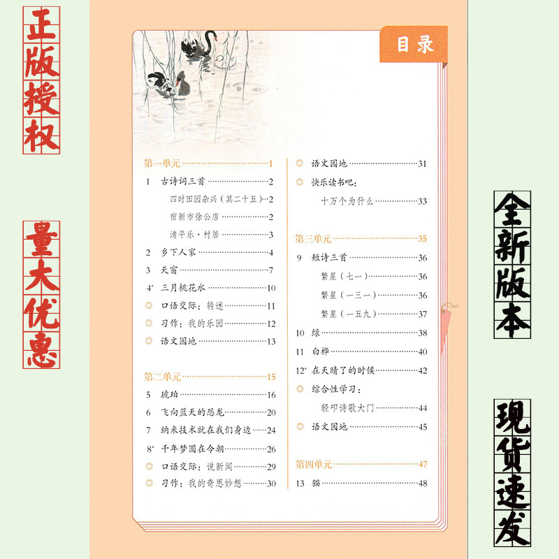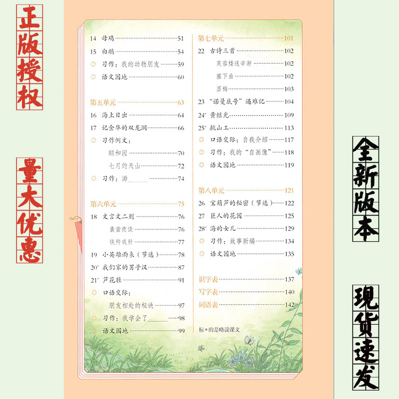 2025年适用正版小学四年级下册语文教材(人教版)是依据国家最新课程标准编写、经教育部审定的权威教科书。本书紧扣核心素养目标,精选文质兼美的课文,涵盖经典诗词、现代散文、寓言故事及实用文体,注重语言积累与表达能力培养。教材编排科学,注重读写结合,设有“口语交际”“习作”“语文园地”等板块,全面提升学生的阅读理解、写作思维和综合语文素养。插图精美,版式清晰,配套资源丰富,适合课堂教学与家庭辅导。作为统编版教材,内容与时俱进,弘扬中华优秀传统文化,培育社会主义核心价值观,是四年级学生语文学习的重要依据和可靠工具。