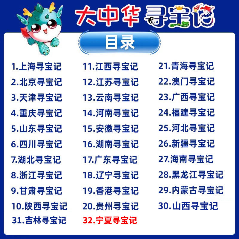 《现货宁夏寻宝记》是“大中华寻宝记”系列2025年新华书店正版新书,延续该系列生动有趣的科普风格,以漫画形式带领3-12岁儿童探索宁夏的历史、地理与民俗文化。全系列共32册,涵盖山西、黑龙江、上海等全国多地,融合地理知识与历史故事,寓教于乐。每册通过寻宝冒险情节,展现地方特色风物,激发孩子对祖国山河的热爱与探索欲。正版保障,内容权威,适合亲子共读,是培养孩子国家认同感和科学素养的理想读物。