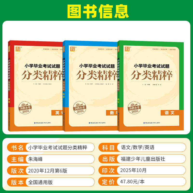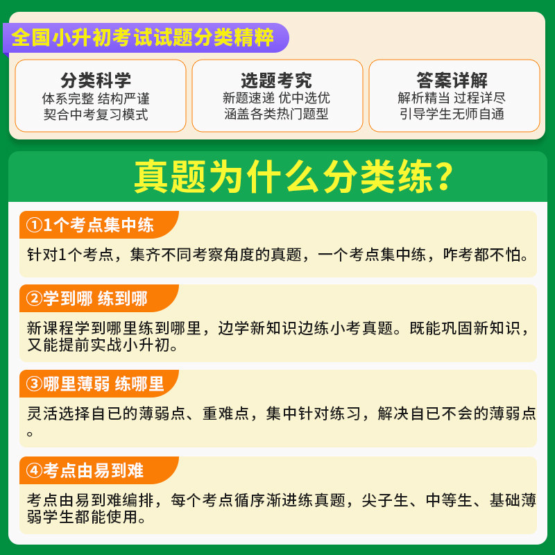 《2026正版通城学典·小学毕业考试试题分类精粹》是一套专为小升初总复习设计的高质量教辅资料,涵盖语文、数学、英语三科,全国通用。本书精选全国多地历年真题,按知识点分类汇编,突出重点、突破难点,帮助学生系统梳理知识体系。配有专项训练与全真模拟试卷,题型全面、难度适中,有效提升应试能力。内容紧扣新课标要求,解析详尽,便于学生自主复习与查漏补缺。无论是夯实基础还是冲刺提分,本套资料都是小学毕业生备战小升初考试的得力助手,助力考生决胜小考,顺利升学。