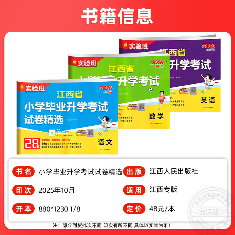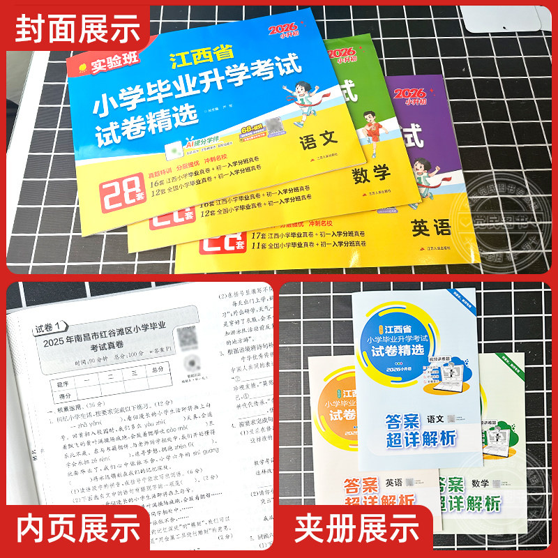 【南昌速发】2026新版《实验班》江西省小学毕业升学考试试卷精选,涵盖语文、数学、英语三科,共28套真题与模拟卷,由春雨教育权威编写。试卷紧扣人教版教材,精准对标江西省小升初考试命题趋势,题型全面、难度分层,兼顾基础巩固与能力提升。精选历年真题与优质模拟题,帮助学生熟悉考试节奏,掌握答题技巧。附详细解析,便于查漏补缺,是小升初总复习、分班备考的理想资料。南昌地区速发,确保及时到货,助力考生高效备考,冲刺理想中学。