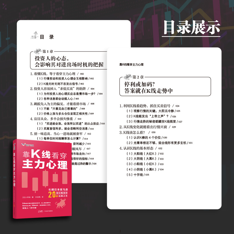 《靠K线看穿主力心理》是日本资深交易员小泽实的经典之作,系统解析56种关键K线形态,揭示主力资金操盘逻辑与心理动向。书中结合日本股市实战案例,将复杂的K线语言转化为清晰的买卖信号,帮助投资者精准判断涨跌趋势。作为日本亚马逊财经类畅销榜长达20年的常销书,本书不仅适用于股票,也对期货交易具有极高参考价值。作者另著《飙股的长相》《做精期货一本通》,形成完整技术交易体系,被誉为东亚技术分析领域的里程碑作品,适合追求稳健盈利的中高阶投资者深入学习。