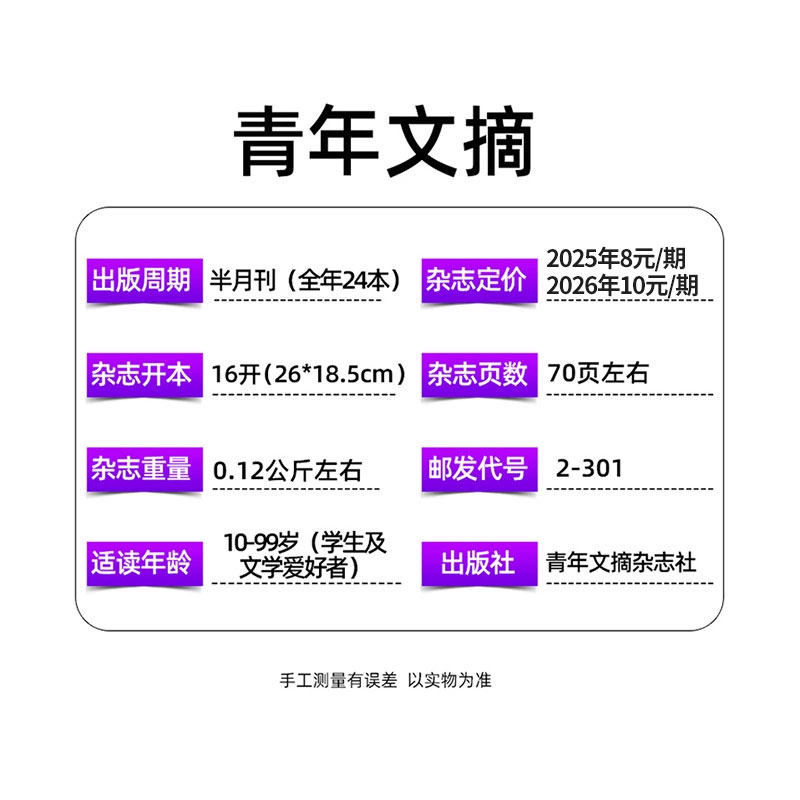 【送好礼】青年文摘杂志订阅 2026年1月起订阅 1年共24期 杂志铺 14-25岁青少年成长文学文摘期刊中学生作文素材课外阅书籍包邮