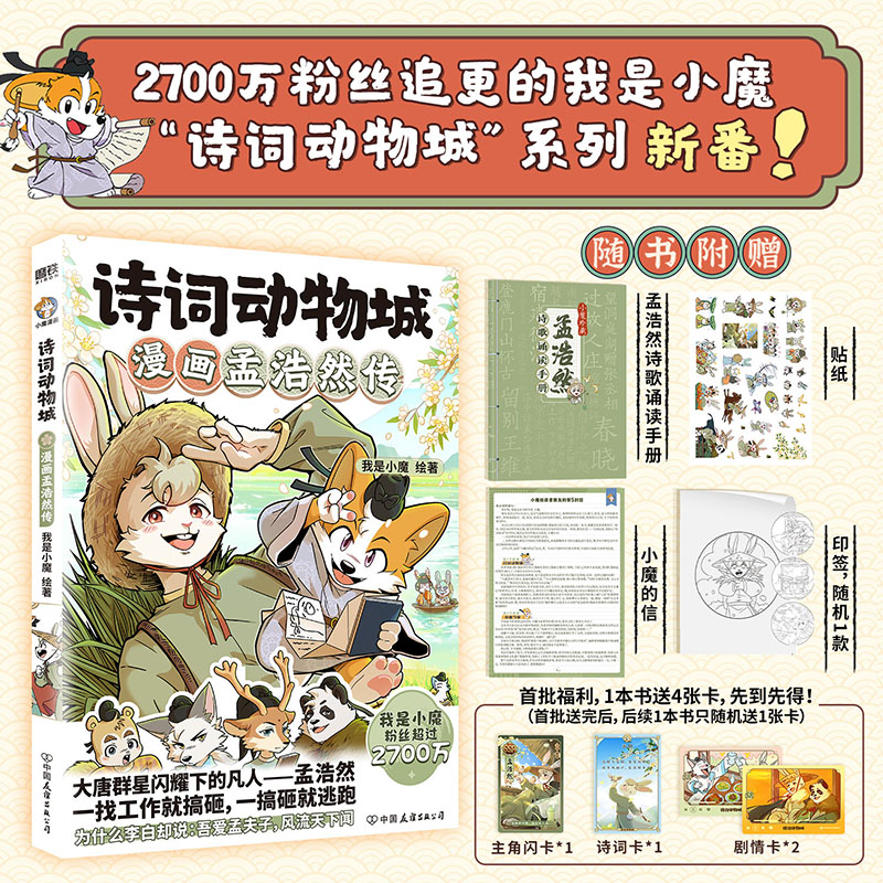 天猫【文轩专享胶片卡】小魔诗词动物城 漫画刘禹锡传+孟浩然传+李白杜甫王维5册 超有趣的美食大冒险大发现漫画绘本传统文化启蒙知识