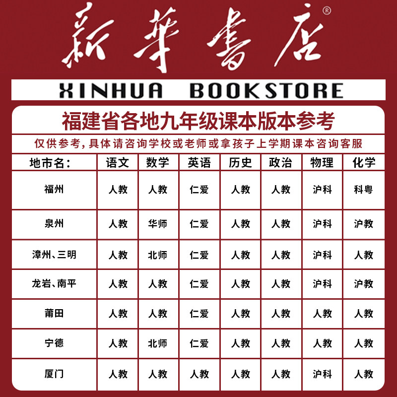 【新华书店】福建专用九年级下册全套课本共3本,涵盖语文、数学、英语等核心学科,适配福建省初中三年级教学要求。教材版本齐全,包括人教版、北师大版、沪教版及仁爱版,确保与本地课程同步。内容紧扣2025年新课标,注重知识衔接与能力培养,适用于初三学生系统复习与预习。道德与法治、历史、物理、化学等科目同步更新,助力学生夯实基础、提升综合素养。正版权威,印刷清晰,是福建地区师生信赖的教学用书。新华书店品质保障,为中考备考提供坚实支持。