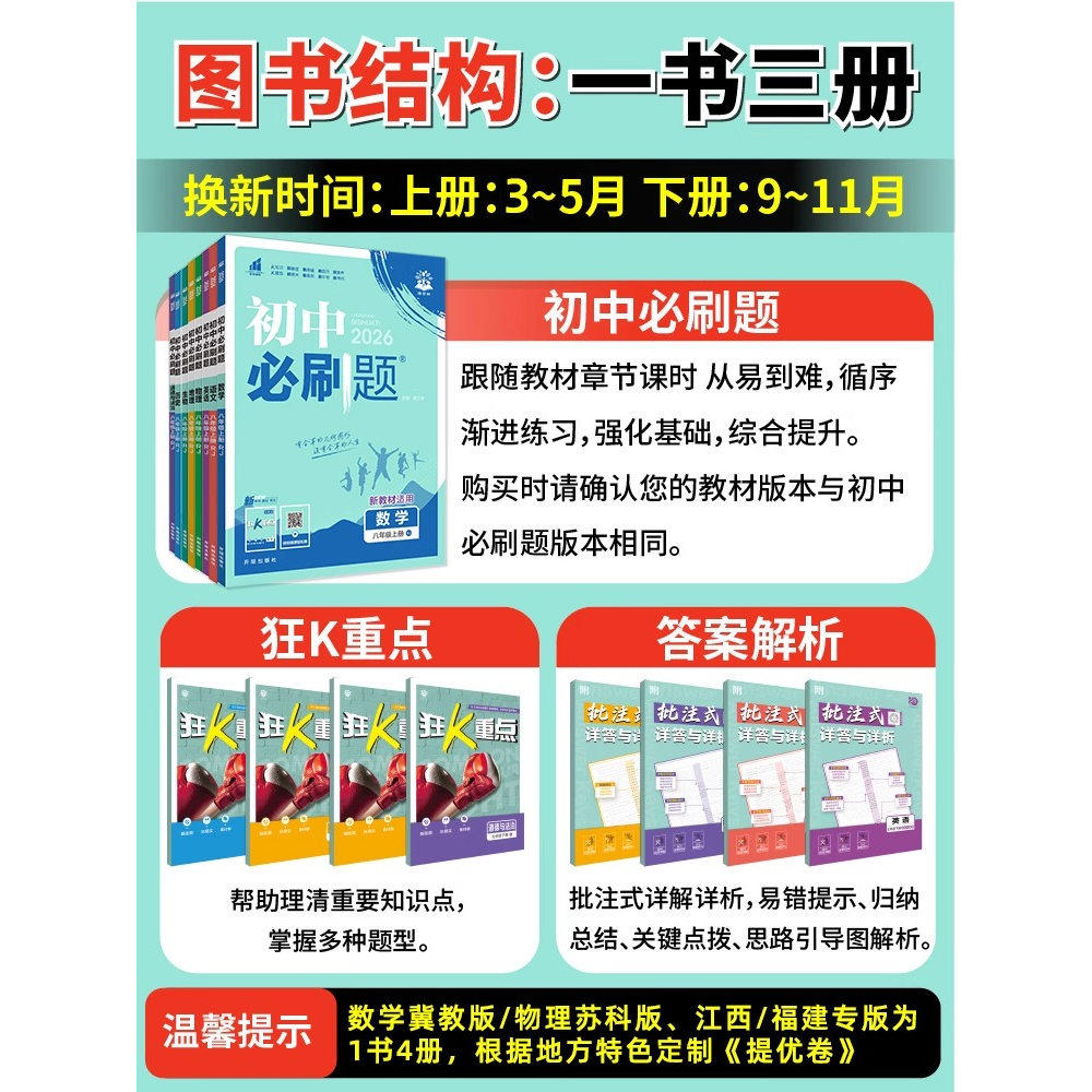 2026春季新版《初中必刷题》涵盖七、八、九年级上下册,科目齐全,包括数学、语文、英语、科学(物理、化学、生物)、政治、历史、地理等,同步教材内容,适配人教版与浙教版。试题紧扣新课标与中考考点,题型丰富,难度分层,注重基础巩固与能力提升。每册配备同步试卷与专项练习,帮助学生系统掌握知识要点,强化解题技巧。八年级上册(8上)内容精准对接学期进度,助力学生夯实基础、高效备考。本套丛书由一线名师精心编写,答案详解详析,是初中生日常练习与中考复习的理想教辅资料,全面提升学科素养与应试能力。
