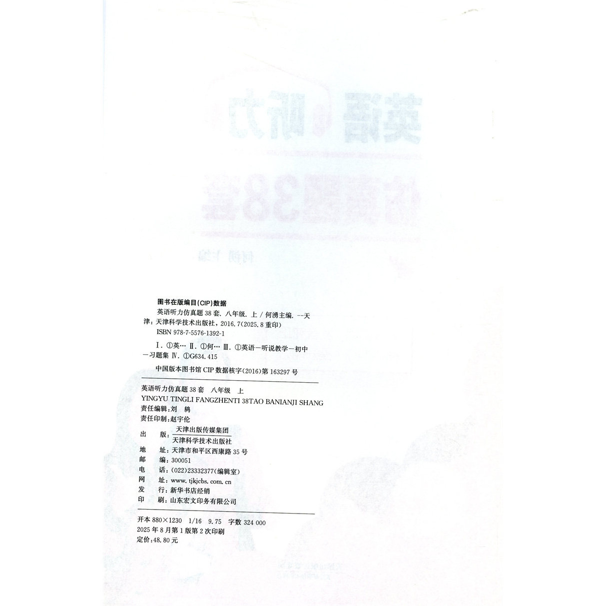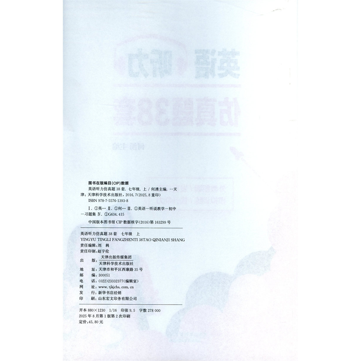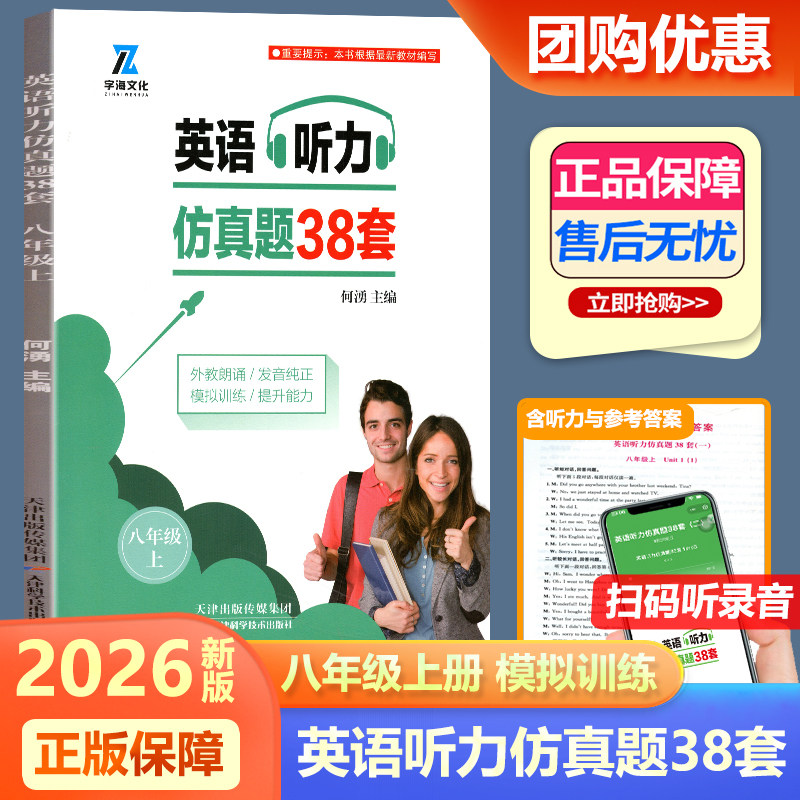 2026新版《英语听力仿真题38套》专为初中七、八年级学生设计,覆盖上下册内容,紧扣中考听力题型与难度,精选38套高质量模拟训练题,全面强化听力应试能力。本书由专业外教朗读,发音纯正、语速适中,真实还原考场听力环境,帮助学生提升辨音、理解与反应能力。每套试题均配有详细解析与答题技巧点拨,便于学生自查自纠。由天津科学技术出版社权威出版,内容科学严谨,是中学阶段提升英语听力的优质辅导资料,助力学生夯实基础、从容应对中考。