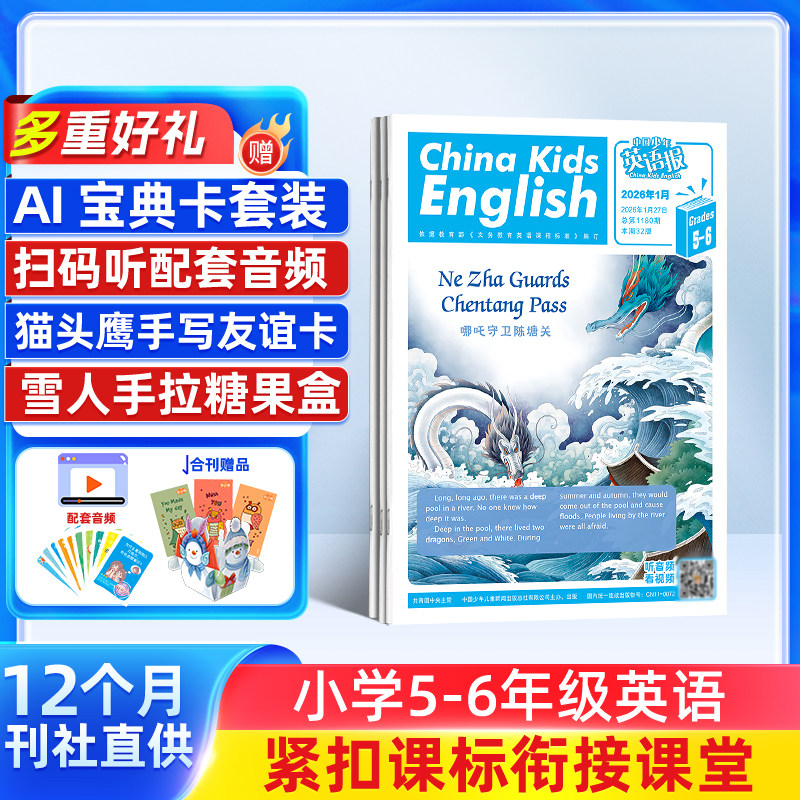 《中国少年英语报》(五六年级版)是一本专为小学5-6年级学生打造的双语学习期刊,自2026年1月起全年订阅共12期。杂志内容生动有趣,融合英语知识与趣味阅读,涵盖故事、科普、文化、校园生活等主题,助力提升英语阅读能力与综合素养。每期配有音频资源,支持扫码听读,帮助孩子们练习发音与听力。语言难度适中,图文并茂,符合高年级小学生的认知水平。通过“送好礼”活动,在杂志铺全年订阅还可享受超值优惠。是孩子课内外英语学习的好帮手,激发学习兴趣,拓展国际视野,陪伴成长每一步。
