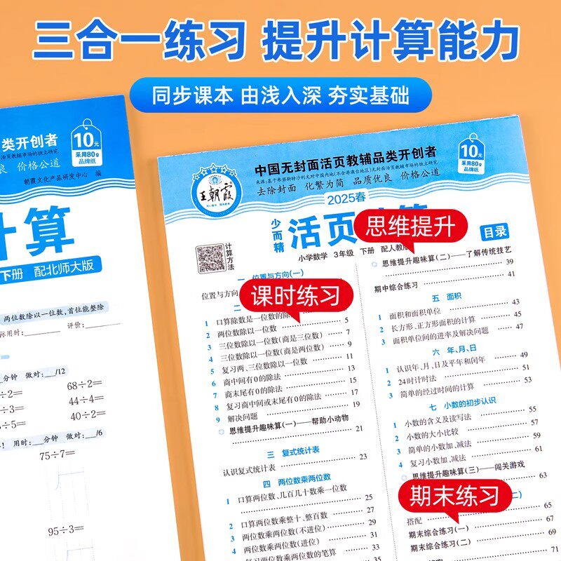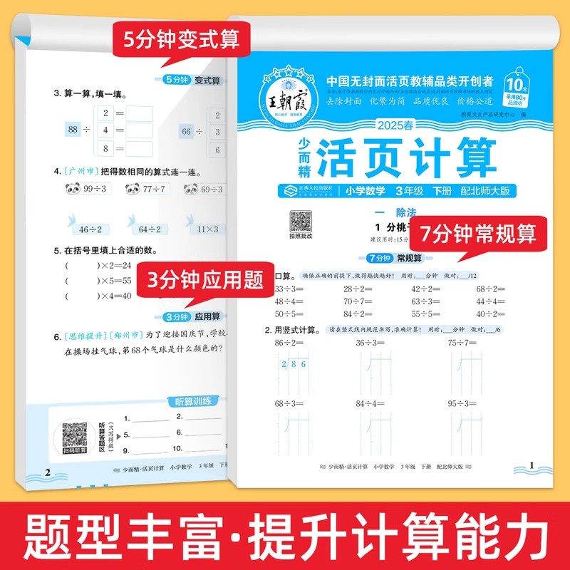《2025秋王朝霞活页计算》专为小学一至六年级学生设计,紧扣人教版、北师大版、苏教版等主流教材,涵盖口算、竖式、脱式计算及思维训练等内容。活页设计便于拆分使用,每日一练,循序渐进提升计算能力。题目分层设置,基础与拓展结合,强化运算技巧与数学思维。配套默写训练与“计算小达人”激励机制,激发学习兴趣。适用于课堂同步练习、课后巩固及假期复习,是提升小学生计算准确率与速度的优质教辅材料,助力学生夯实数学基础,轻松应对各类计算挑战。