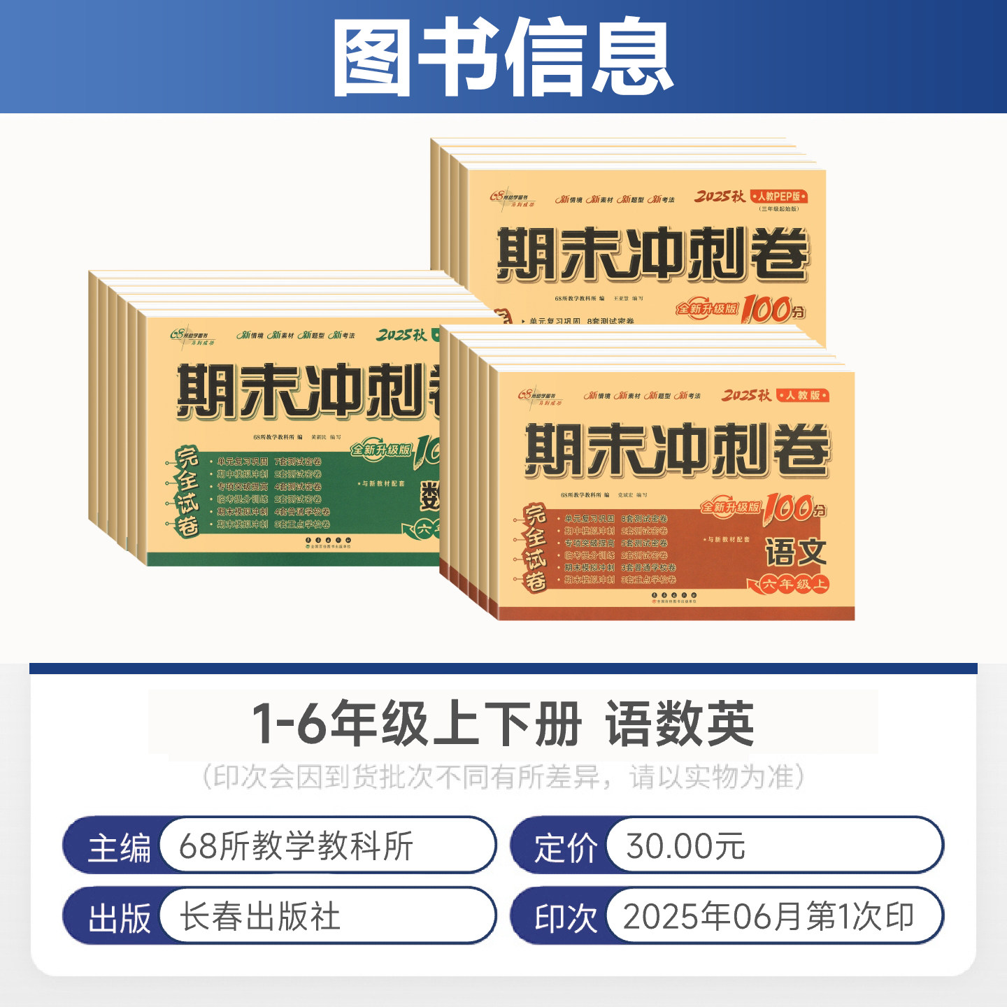 《北京版》25秋期末冲刺100分试卷测试卷全套,涵盖小学一至六年级上下册,严格依据人教版教材编写,同步语文、数学、英语三科重点知识。精选自全国68所名校经典题型,紧扣教学大纲与考试热点,题型丰富、难度适中,注重基础知识巩固与能力提升。每册包含单元练习、专项训练与期末模拟卷,帮助学生系统复习、查漏补缺,有效提升应试能力。试卷排版清晰,答案详解,便于学生自测与家长辅导,是小学生期末复习的理想辅助资料,助力轻松冲刺满分,夯实学习基础。