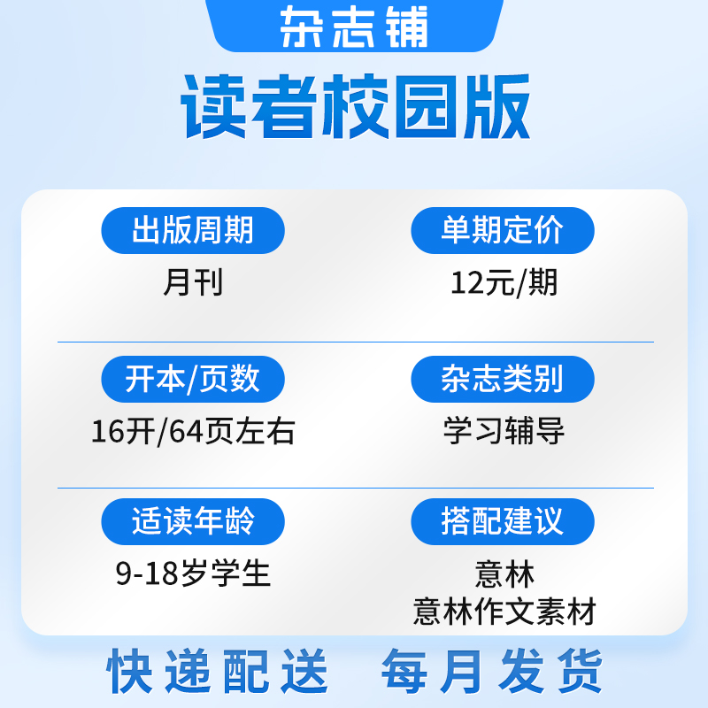 天读者旗舰店 2025年《读者》(校园版 •成长) 跨年订阅 2026年大征订全年订阅 共12本官网正版期刊杂志订阅作文素材写作提升包邮