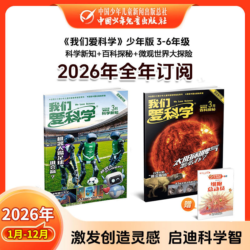 《我们爱科学》2026年1-12月全年订阅,专为6-12岁小学生精心打造,涵盖儿童版(1-3年级)、少年版(4-6年级)及《科学大侦探》三大系列。内容融合科普知识与儿童文学,通过生动故事、趣味实验、前沿科技和侦探推理,激发孩子的好奇心与探索欲。每期紧扣课内外知识点,图文并茂,语言浅显易懂,兼顾知识性与趣味性。全年12期系统呈现天文、地理、生物、物理等多领域科学奥秘,助力提升科学素养与阅读能力。订阅即享连贯学习体验,是小学生课外阅读的理想选择,让科学不再遥远,让探索成为习惯。