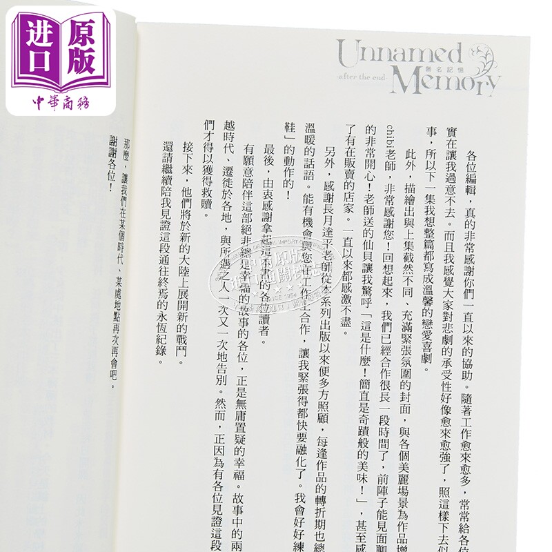 《Unnamed Memory 无名记忆 after the end》第3集(首刷附录版)由东立出版,为台湾正版授权轻小说。本集延续精灵剑士奥斯卡与禁忌魔女露米娜的奇幻旅程,在“终结之后”的世界中揭开更多关于无名记忆与命运交织的谜团。剧情深入探讨两人羁绊与世界的真相,情感张力十足。首刷版特别附赠精美特典,如角色插画卡或短篇别册,极具收藏价值。作者古宫九时以细腻笔触描绘宏大世界观,搭配插画师L.O.的唯美画风,为读者呈现一场视觉与心灵的双重盛宴。适合喜爱奇幻 romance 与命运主题的轻小说爱好者。