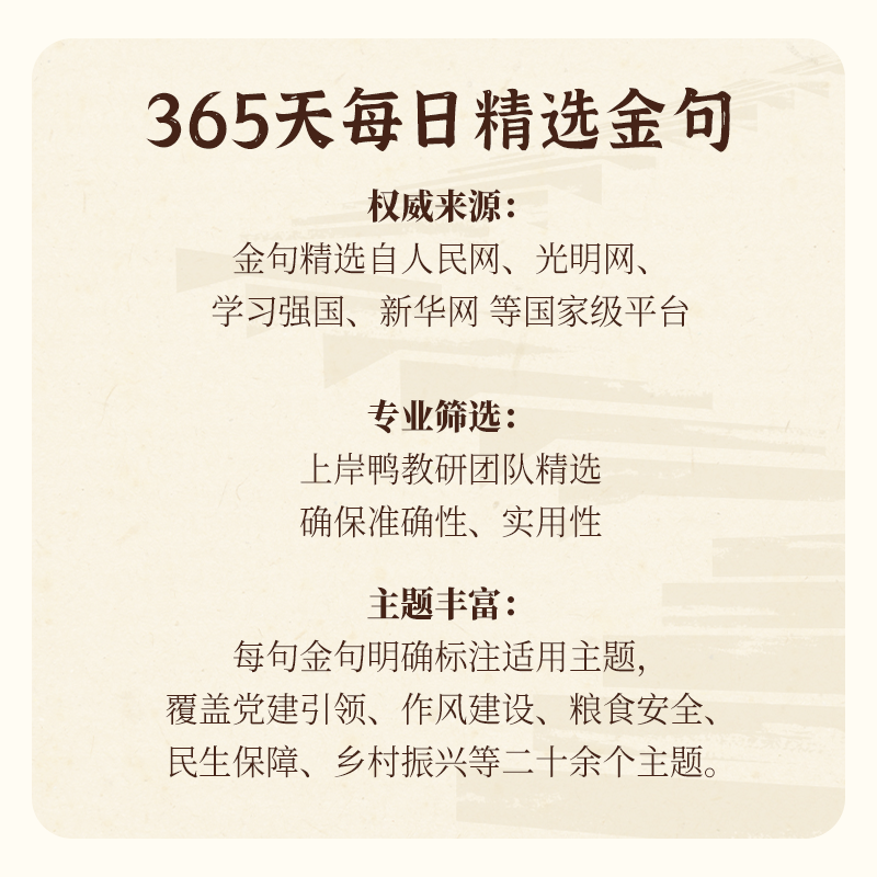【上岸鸭公考】高顿日知录申论每日金句迷你日历,专为公考学子打造,精选365条申论高频金句与写作素材,涵盖时政热点、社会民生、生态文明等核心主题。每日一页,轻松积累,助力申论提分。小巧便携设计,可轻松放入口袋或包包,随时随地翻阅学习,充分利用碎片时间。无论是通勤途中、课间休息,还是备考间隙,都能高效积累写作语料,提升表达水平。搭配科学编排与实用排版,让学习更系统、更高效。上岸鸭公考携手高顿教育,助你日积月累,厚积薄发,轻松应对申论写作挑战,迈向成功上岸之路。