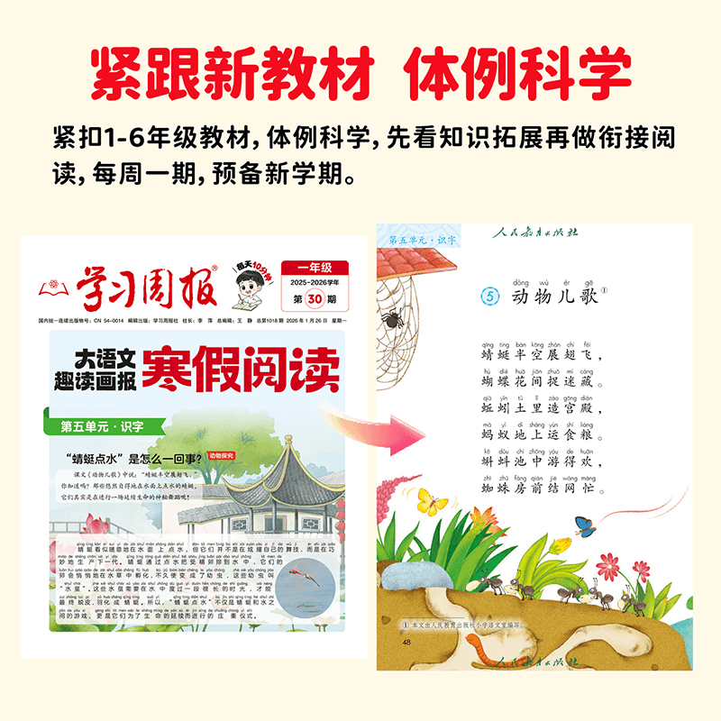 《学习周报·大语文趣读画报》2026版寒假阅读报,专为1-6年级学生设计,助力寒假学习衔接与知识拓展。内容紧扣新课标,同步各年级语文教材,融合趣味阅读、文化拓展与语言训练,每周一练,轻松巩固课内知识,提升阅读理解能力。精选经典美文、传统文化故事及时代热点素材,图文并茂,激发阅读兴趣。同时设置“预备新年级”专题,帮助学生平稳过渡,夯实基础。作为一本兼具知识性、趣味性与实用性的期刊报纸,它让寒假学习更高效、更有趣,是孩子假期语文学习的优质伙伴。