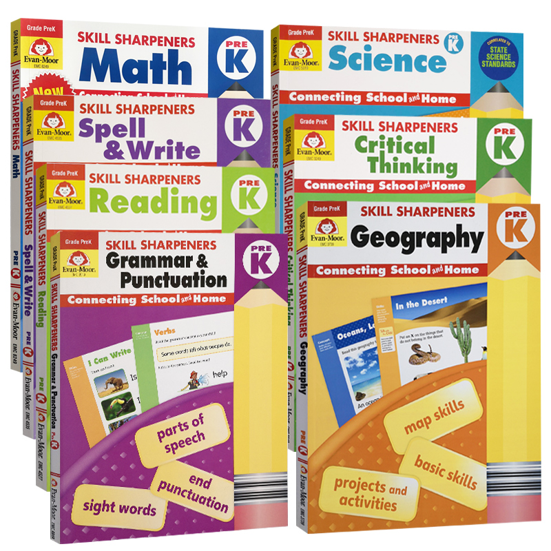 天猫Evan-Moor Skill Sharpeners Grade PreK Set. 技能铅笔刀 幼儿园到小中班 全7科目原版套装拼写数学科学语法地理少儿启蒙儿童英语