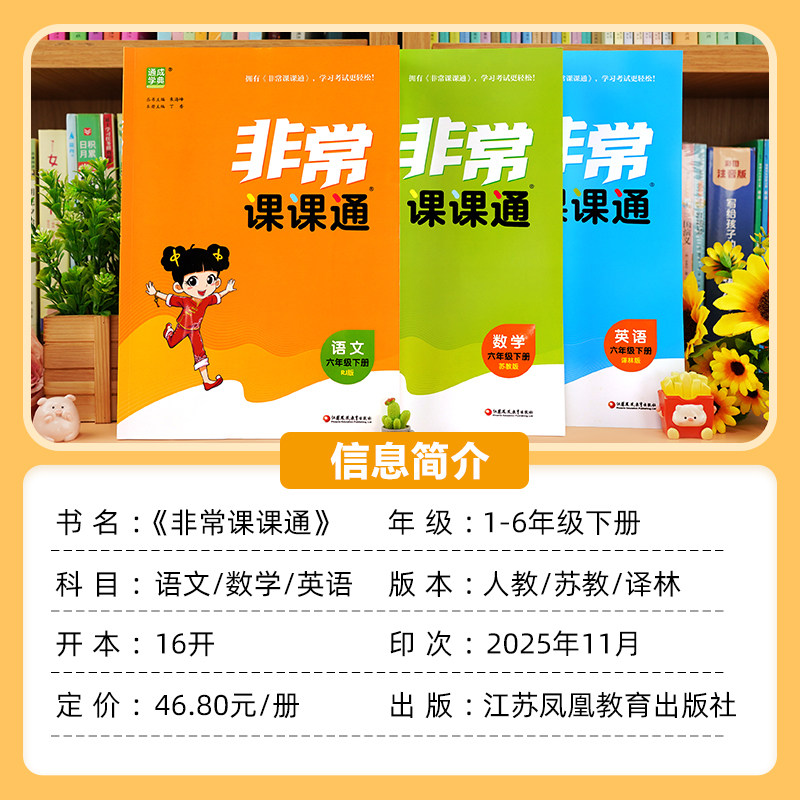 《25秋26春非常课课通》是一套专为小学一至六年级学生设计的同步学习资料,涵盖语文(人教版)、数学、英语(译林江苏教版)全册内容。本书紧扣教材大纲,系统梳理每课知识点,配备课前预习单、课堂笔记及课后巩固练习,帮助学生高效掌握重点难点。内容编排科学,语言通俗易懂,注重基础与拓展结合,适合学生自主预习、课堂听讲和课后复习使用。无论是夯实基础还是提升能力,都能提供有力支持,是小学生日常学习与教师教学参考的理想辅助工具,助力学生轻松应对学期学习任务。