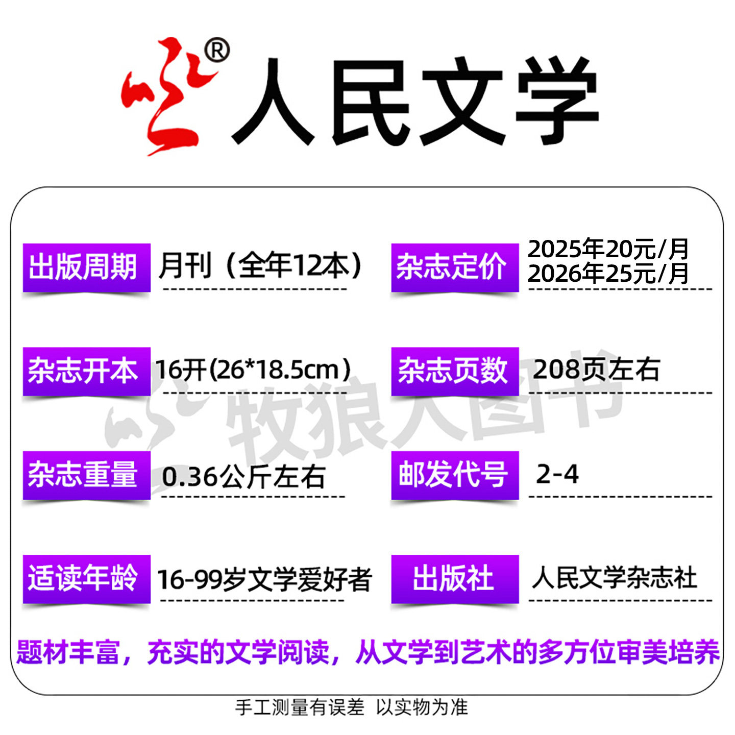 《人民文学》2026年1月及2025年1–12月全年/半年订阅火热进行中!作为中国最具影响力的文学期刊之一,《人民文学》持续刊载优秀长篇小说、短篇小说、散文、诗歌及文学评论,荟萃当代华语文学精品。本期特别推荐《红楼梦》研究杂文特辑,深度解析经典,兼具学术性与可读性。同时精选《收获》《十月》等名刊佳作,涵盖多元题材与风格。现订阅即赠精美书签一枚,雅致实用,致敬阅读之美。非过刊,正版发行,适合文学爱好者、研究者及收藏者。无论是全年深度陪伴,还是半年精选体验,皆是滋养心灵的理想之选。立即订阅,共赴一场丰盈的文学之旅。