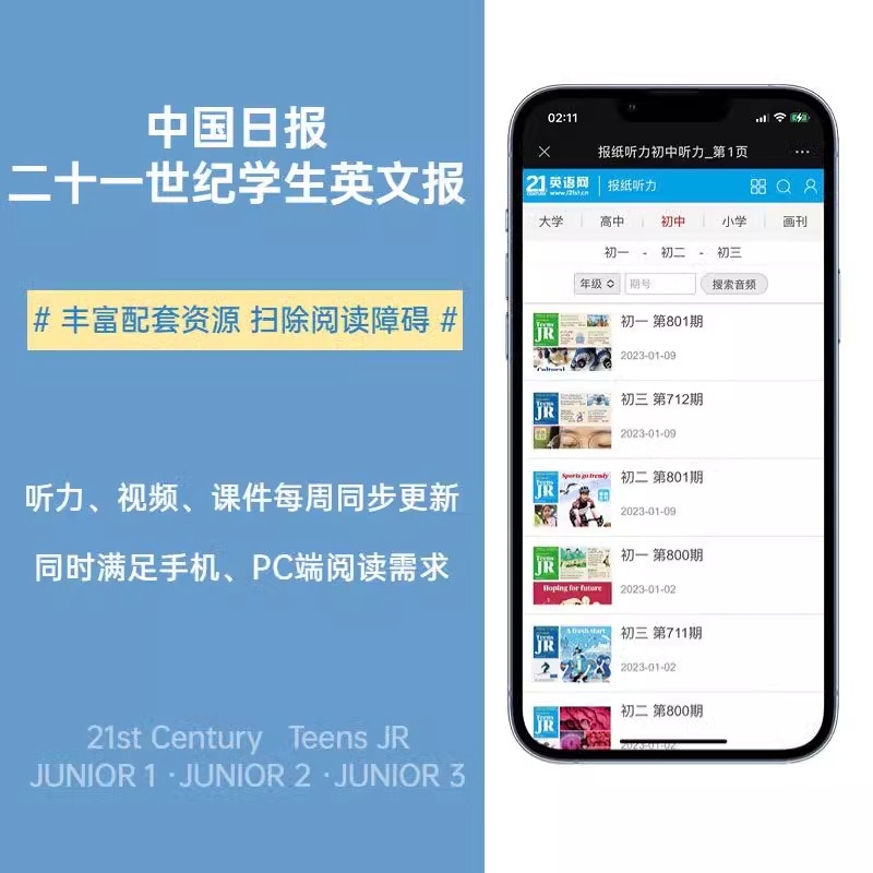 《21世纪英语报》小学版/初中版/高中版,针对不同年龄段的学生量身定制,内容涵盖英语知识和文化教育等多个方面。该报纸适合年龄在初一至高三的学生订阅阅读,每个学期订阅周期为春秋季学期。这份报纸以周报形式发行,内容充实有趣,是学生提升英语水平和文化素养的好帮手。适合少儿阅读的英文杂志《teens》是其下属的初中生版本之一。想要学习英语知识的家长或孩子可订阅阅读,非常适合课后扩展英语学习资料库。