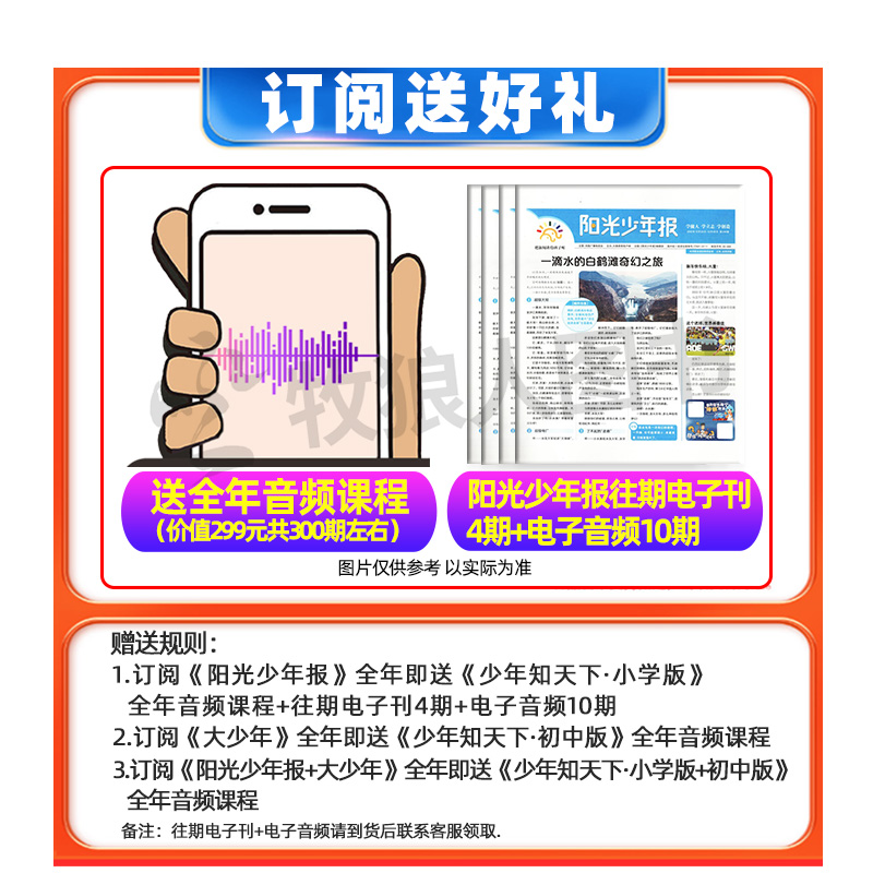 【新/送音频】阳光少年报,针对不同年龄段的学生精心打造。小学版内容丰富,大少年初中版更加深入。订阅时间覆盖全年或半年,囊括了春夏秋冬四个季度的合订本。时事报纸、故事书、杂志一应俱全,还有丰富的过刊供孩子们翻阅。孩子们在阅读中可以了解时事动态,拓展知识面,提高学习兴趣。适合孩子阅读成长的优质读物。