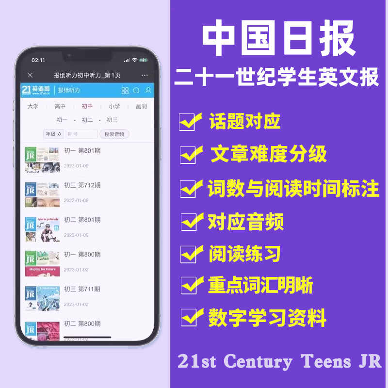 【特价现货】不同学段的英文学习报来袭!包括小学版、初中版和高中版 21世纪英语报,春秋学期全新推出。报纸内容涵盖初一至高三学生的英文学习需求。报纸以最新资讯、实用知识和趣味文章为主,旨在提高学生们的英语阅读能力,拓宽国际视野。无论是巩固基础知识还是提高进阶能力,这款英文报纸都是学生的最佳学习伙伴。特价优惠,数量有限,快来选购吧!