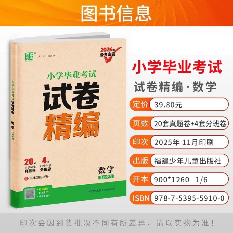 《2026小学毕业考试试卷精编》(江苏适用)由通成学典精心编写,涵盖语文、数学、英语三科,专为六年级学生小升初总复习打造。本书精选24份高质量小考试卷,紧扣江苏地区最新教材与考纲,题型全面、难度适中,全面检测基础知识与综合能力。内容编排科学系统,注重知识梳理与实战演练相结合,帮助学生查漏补缺、提升应试技巧。试卷解析详尽,便于学生自主复习与家长辅导。正版由新华书店发行,品质保障,是小学毕业冲刺阶段的理想复习资料,助力学生从容应对升学考试,夯实基础,稳步提分。